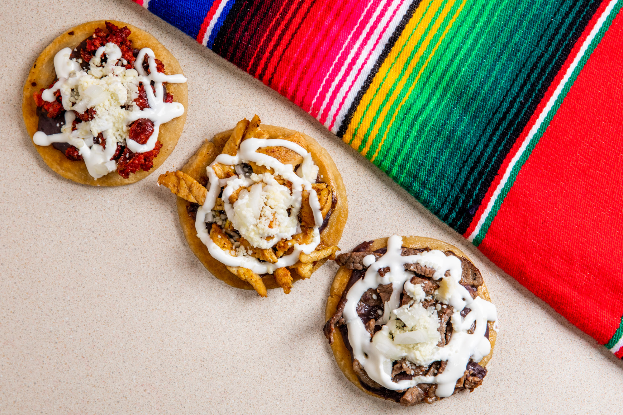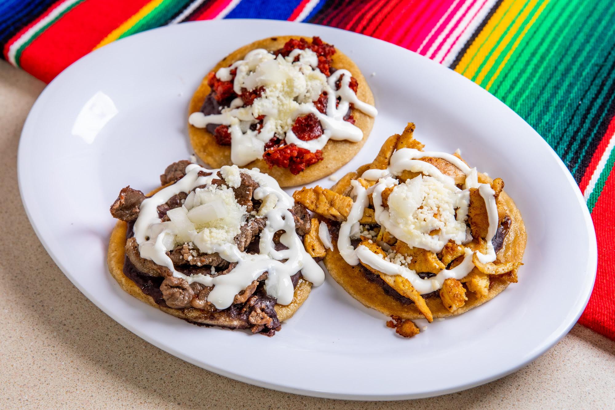 A freshly made, thick and soft corn tortilla coated with refried beans, topped with sour cream, and crumble Cotija cheese, onion and red sauce.