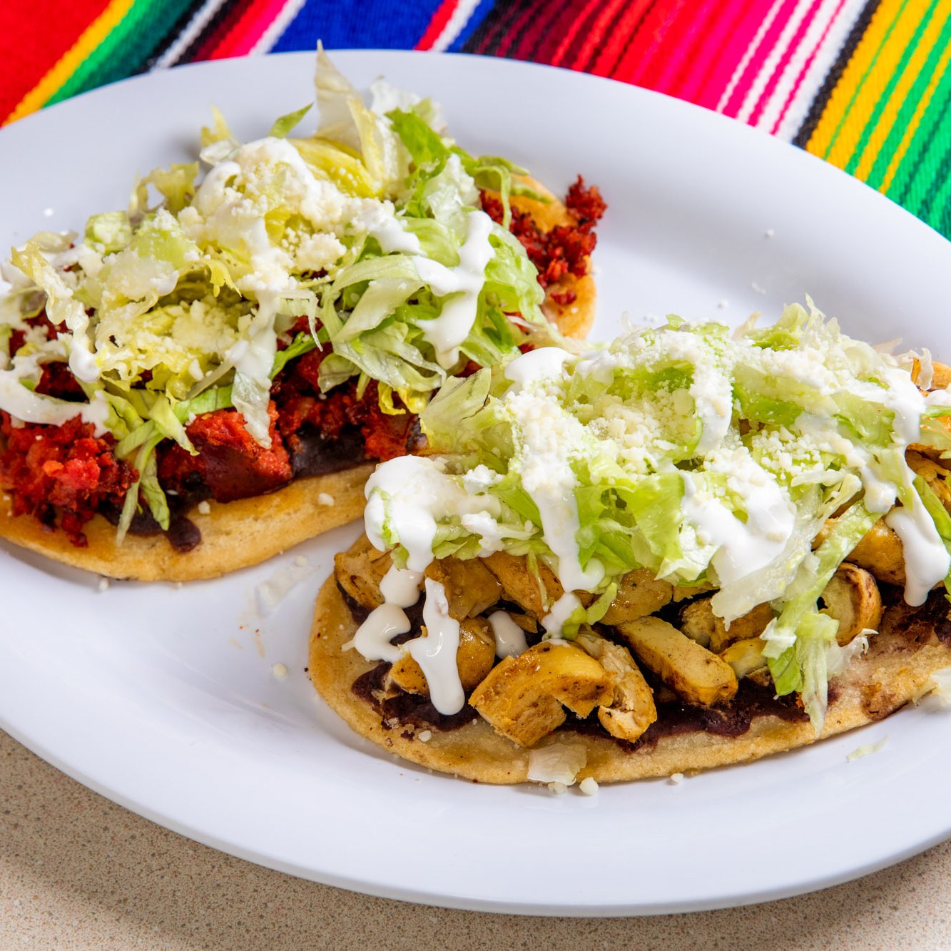 Topped with avocado, Cotija cheese, cilantro, onions, garnished with lime wedge and radish. Choice of green, red or guacamole sauce.