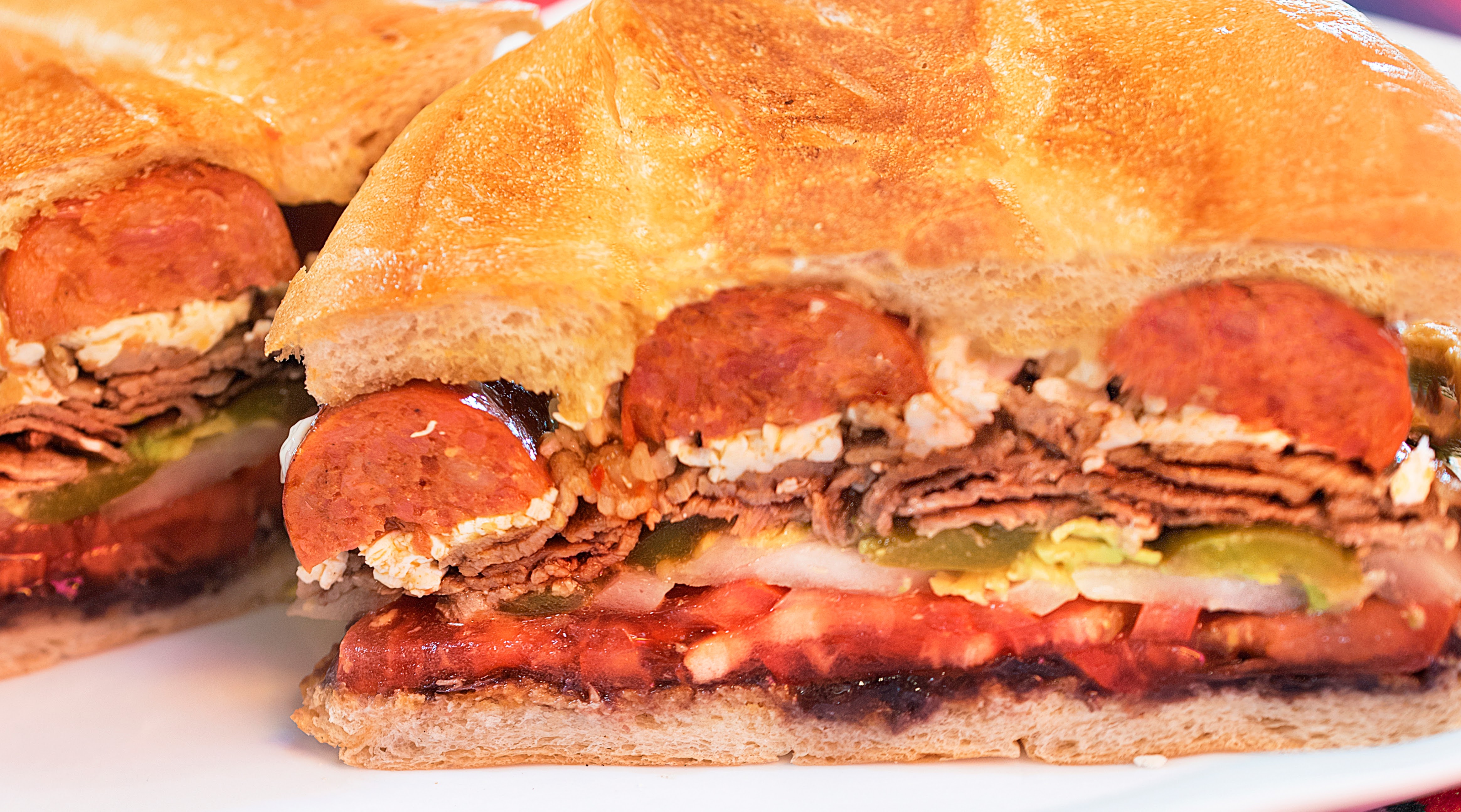 This traditional Mexican sandwich comes with breaded steak, hot dog sausage, ham, egg, American cheese and Mexican cheese. It is served on telera toasted bread, coated with refried beans and mayo, with slices of tomato, onions, jalapeños and fresh avocado.