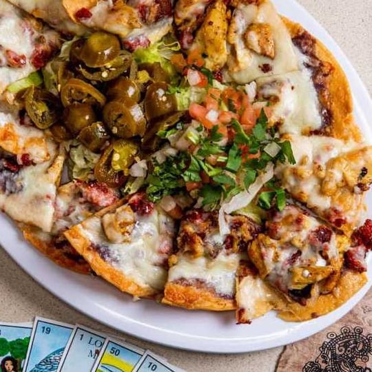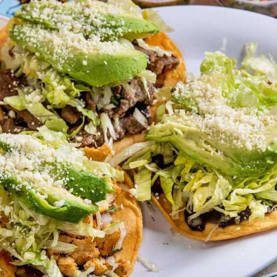 Crispy corn tortilla coated with refried beans, lettuce, slices of fresh avocado and topped with powdered Cotija cheese.
