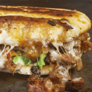 This traditional Mexican sandwich comes with grilled steak, Mexican sausage, topped with melted Mexican cheese. It is served on telera toasted bread, coated with refried beans and mayo, with slices of tomato, onions, jalapeños and fresh avocado.