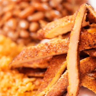Grilled sliced all-white meat chicken. Served with rice beans, option of corn tortillas or bread.