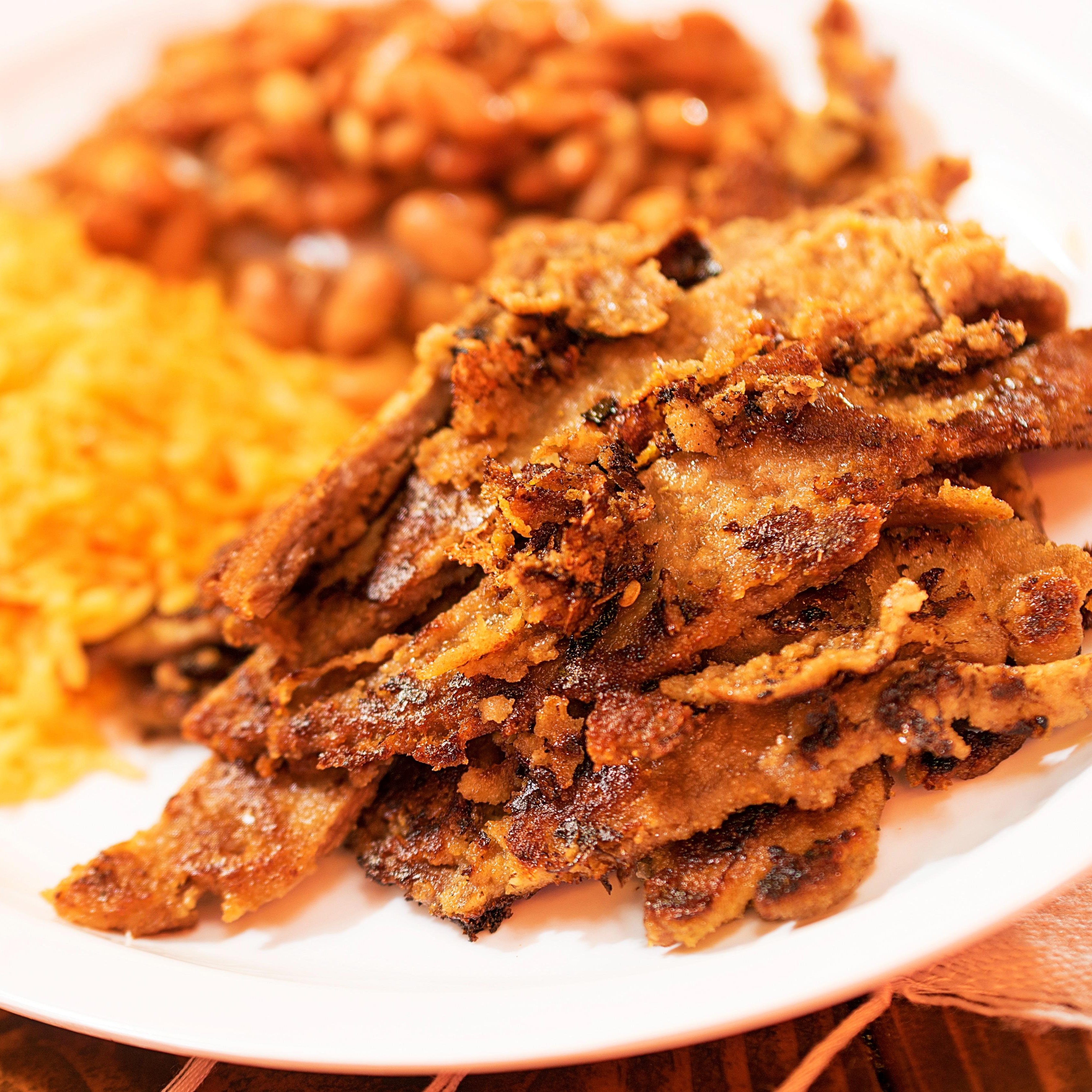Breaded steak. Served with rice beans, option of corn tortillas or bread.