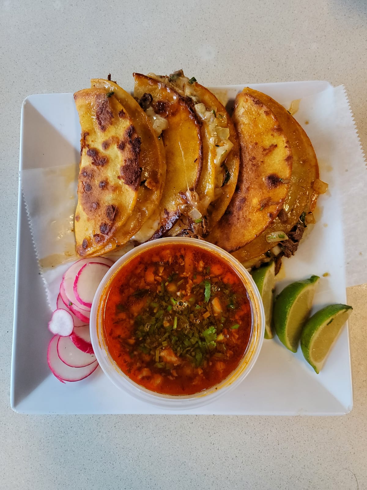 3 Small taquitos CDMX style, with onions and cilantro, garnished with lime wedges and radish. Accompanied with your choice of two sauces (salsa verde, salsa roja, or guacamole sauce).