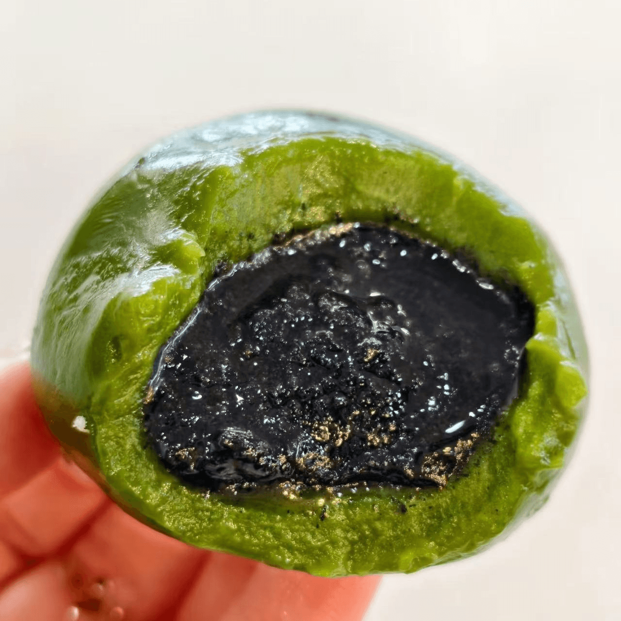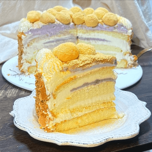 Layers of light original chiffon cake filled with smooth soymilk cream and creamy taro paste, finished with delicate soymilk whipped cream for a uniquely textured and flavorful treat. Topped with soft milk mochi and surrounded by a crispy butter biscuit layer, then dusted with roasted soybean powder.