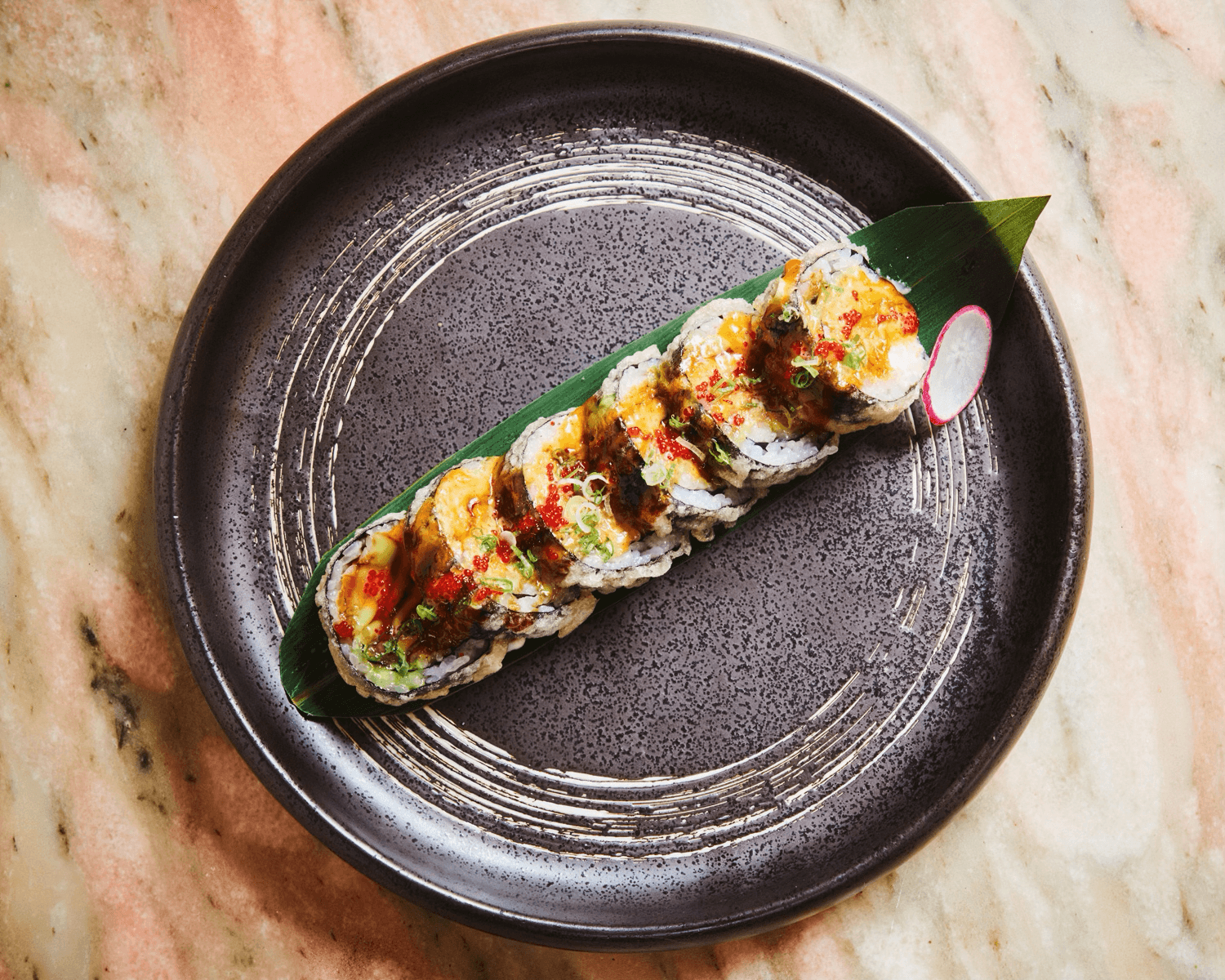 Spicy crunchy tuna and yellowtail on the inside, topped with spicy crunchy crab meat