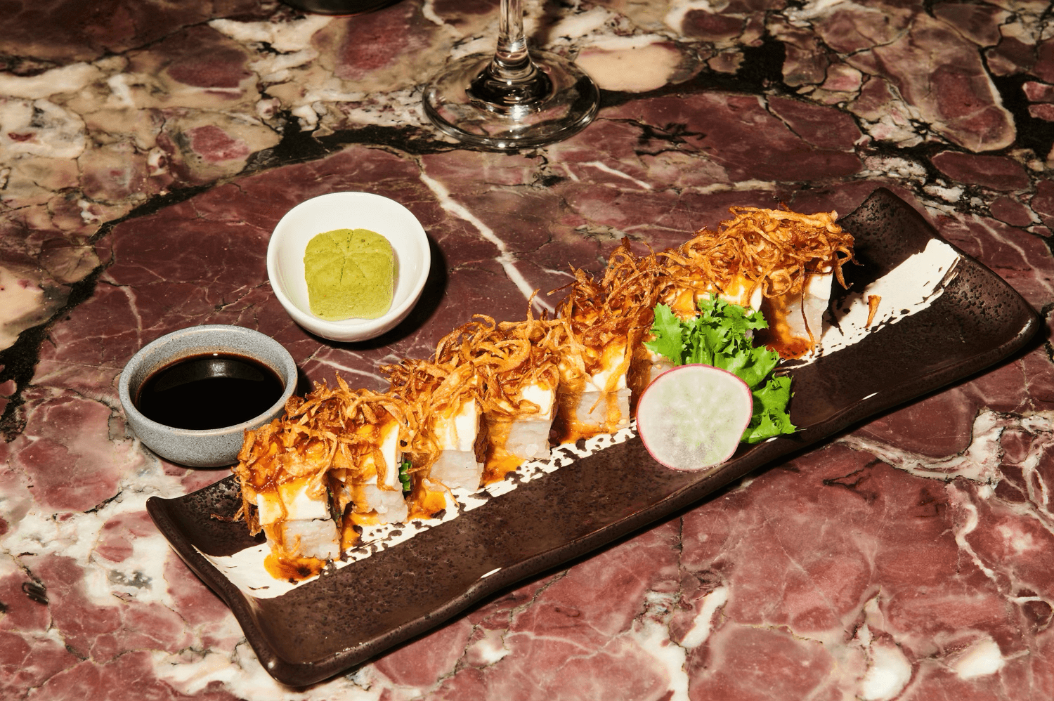 Deep fried cubes of sushi rice topped with spicy tuna and avocado